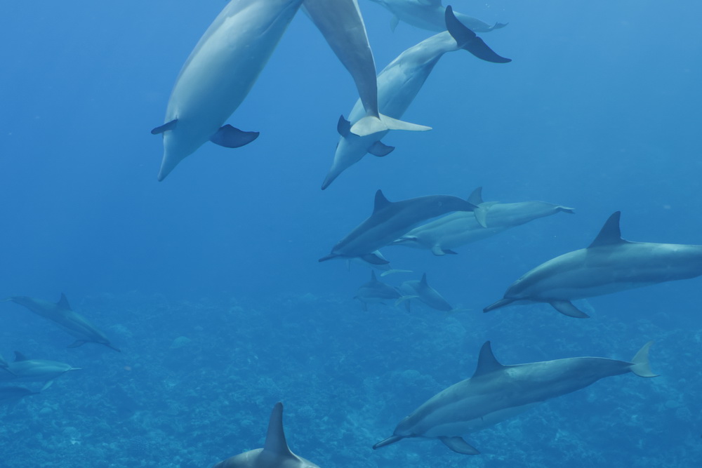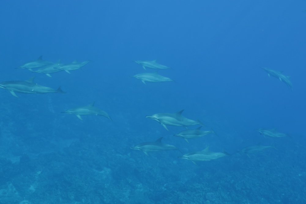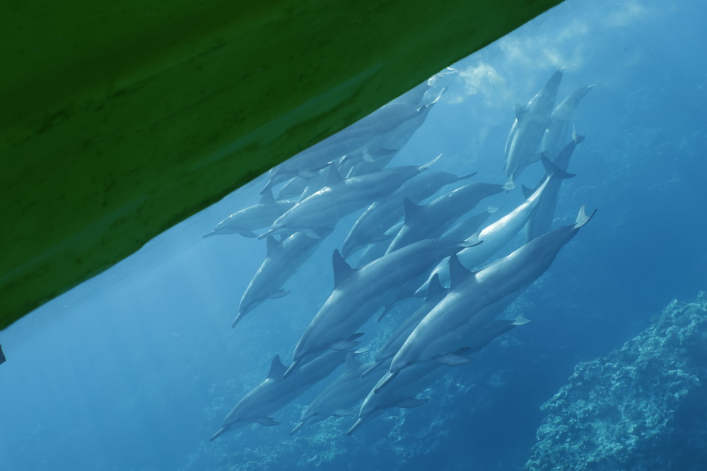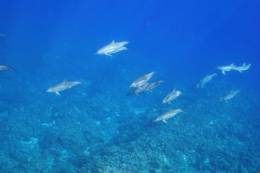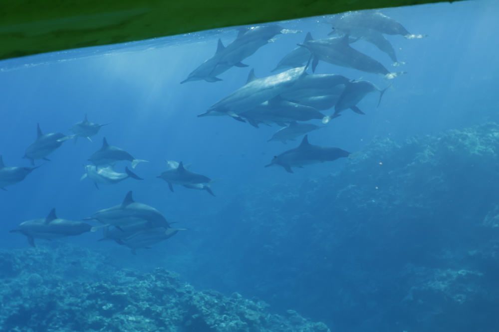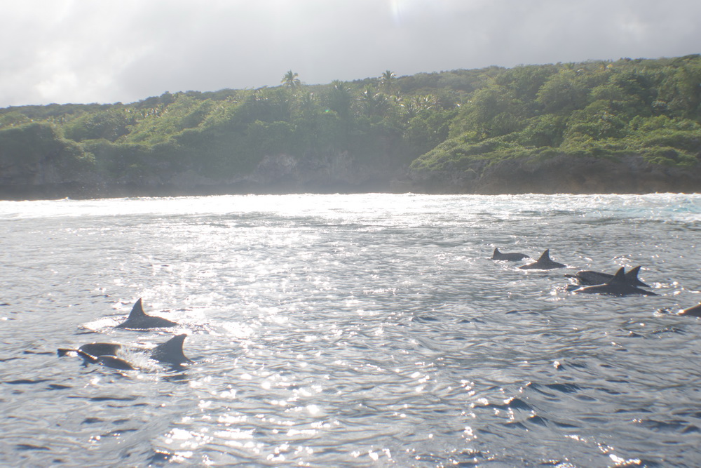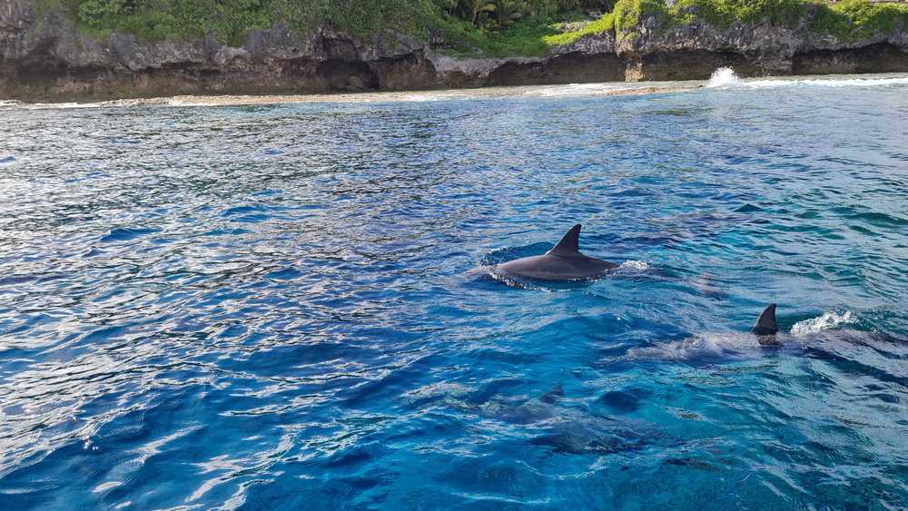 And then we were already on our last day on Niue… the water was a bit choppy that day and we had to go to Alofi to get in the water. In general there are two places where the zodiacs can go in the water. One is a small beach close to the hotel, the other one is the harbor in Alofi. The boats have kinds of cranes that lift them in and out of the water. So Niue Blue always decides in the mornings (or afternoons) where to go. Depends on the weather and where the whales have been seen. So on our last day we went out with Roxy again and while I am sad that Ant was not with us that morning it was good for me that a different guide was there. The rest of the group wanted to start looking for dolphins instead of whales and we were very, very lucky to find a pod of maybe 100 dolphins. To snorkel with them no fins allowed and you have to hold on to a rope attached to the boat. I was not sure that I would be able to do that. I wanted to but was really a bit afraid I couldn’t do that. But Flo, the guide, started to talk to me. He very gently convinced me that I needed to go in. He promised to help me and hold on to me and that is what he did. I am still grateful to him that he convinced me that I was able to go in. As you can see below I have lots of pics of the dolphins (not edited yet). I was not in the water very long but there is a pic of me coming out of the water with that big smile on my face. My wrists hurt badly in the evening but I would do it again. It was well worth the pain. 😉
