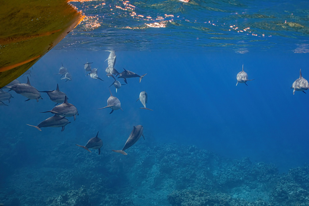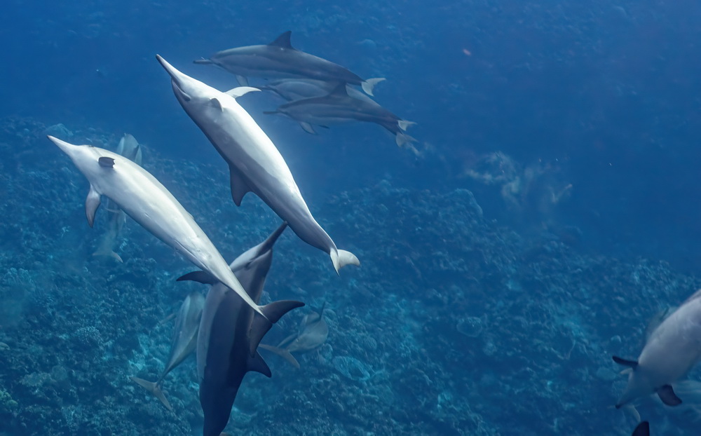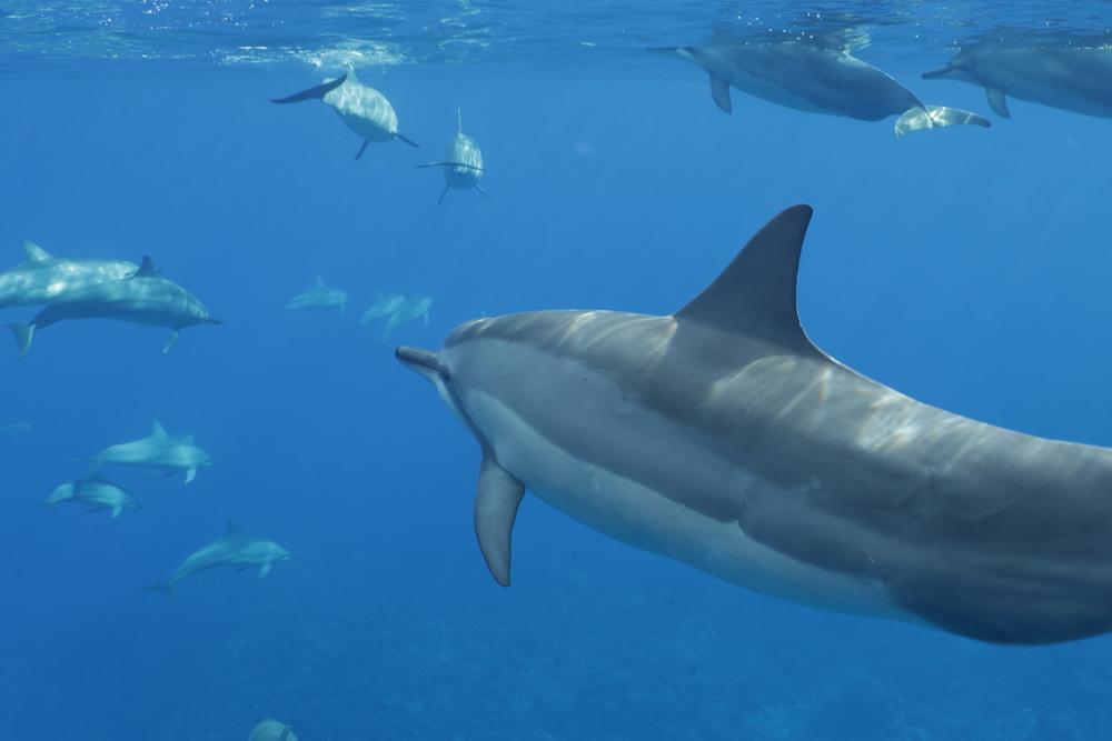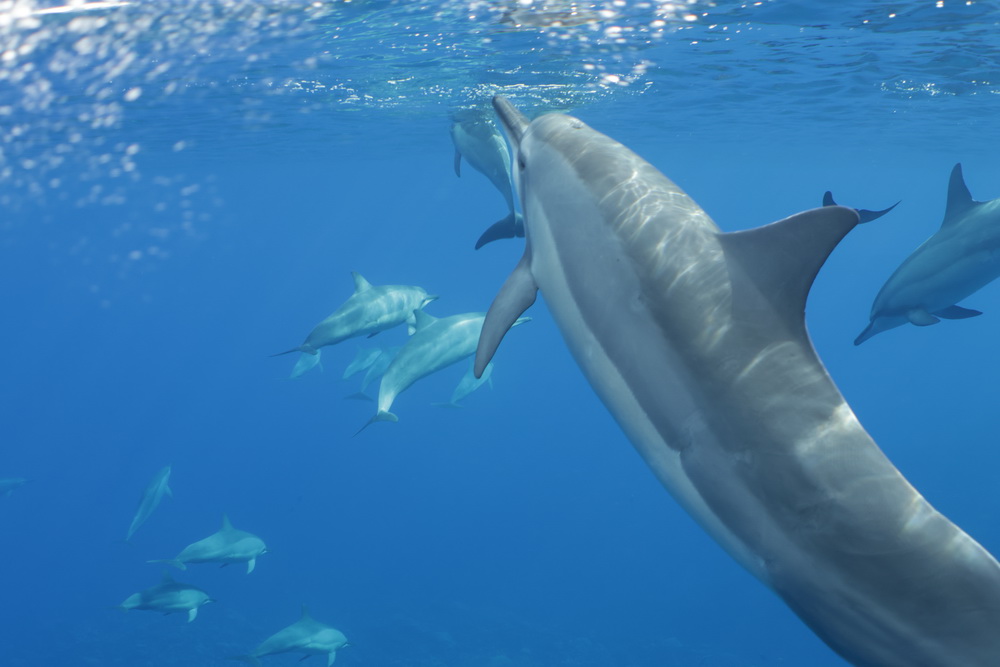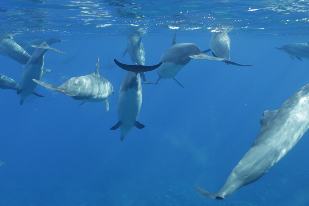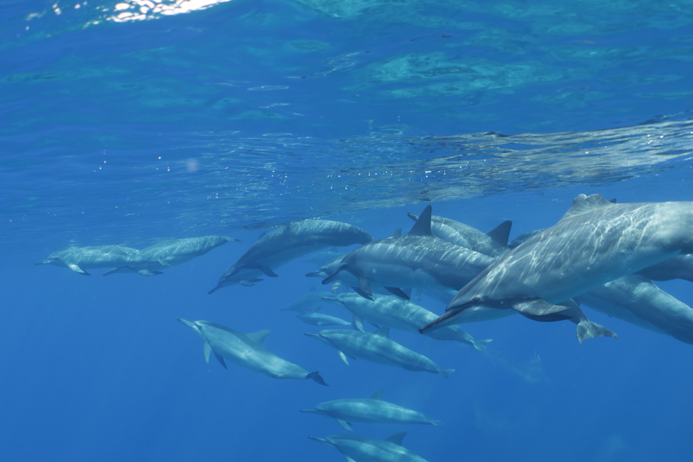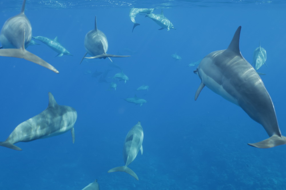 And then we were already on our last day on Niue… the water was a bit choppy that day and we had to go to Alofi to get in the water. In general there are two places where the zodiacs can go in the water. One is a small beach close to the hotel, the other one is the harbor in Alofi. The boats have kinds of cranes that lift them in and out of the water. So Niue Blue always decides in the mornings (or afternoons) where to go. Depends on the weather and where the whales have been seen. So on our last day we went out with Roxy again and while I am sad that Ant was not with us that morning it was good for me that a different guide was there. The rest of the group wanted to start looking for dolphins instead of whales and we were very, very lucky to find a pod of maybe 100 dolphins. To snorkel with them no fins allowed and you have to hold on to a rope attached to the boat. I was not sure that I would be able to do that. I wanted to but was really a bit afraid I couldn’t do that. But Flo, the guide, started to talk to me. He very gently convinced me that I needed to go in. He promised to help me and hold on to me and that is what he did. I am still grateful to him that he convinced me that I was able to go in. As you can see below I have lots of pics of the dolphins (not edited yet). I was not in the water very long but there is a pic of me coming out of the water with that big smile on my face. My wrists hurt badly in the evening but I would do it again. It was well worth the pain. 😉