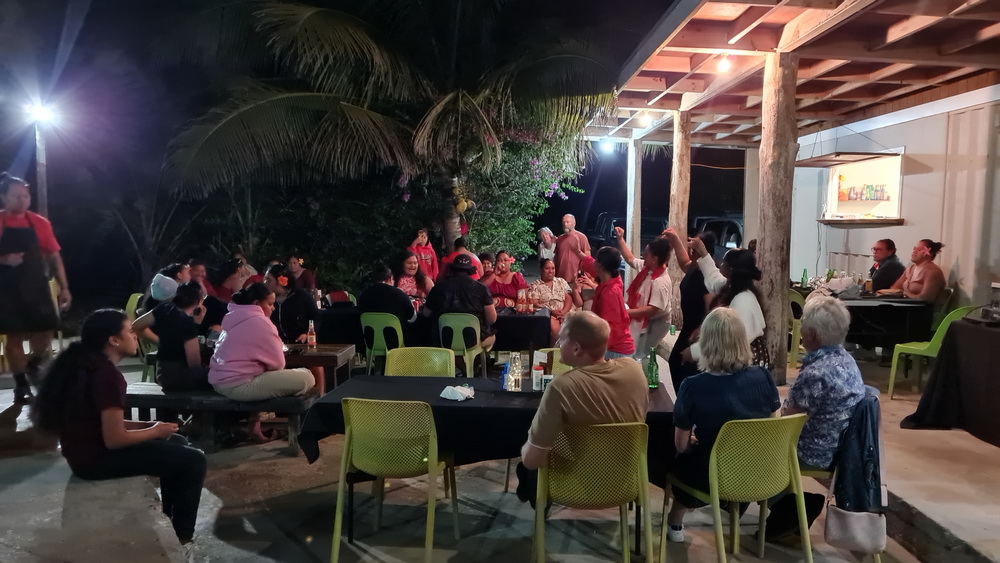 On our last evening there was the restaurant where we had gone to eat most evenings and they had a DJ. Part of the Niue Blue team came over as well and we went there after our dinner. It was a very special party. A big group seems to be a community from Tonga. And boy, the can celebrate. I was impressed by three ladies sitting at a table and it obviously one of them was birthday girl. They were so happy. Just looking at them makes you feel good. The entire community was like that. Pure south pacific happynes… from what we heard they celebrated until 4 AM in the morning. But the next morning when we were at breakfast we saw a wedding party coming in for a reception at 7:30 AM. And that were the same people we had seen at the party the evening before. The wedding was at 6:30. Looks like sleep is way overrated… 😉 😀