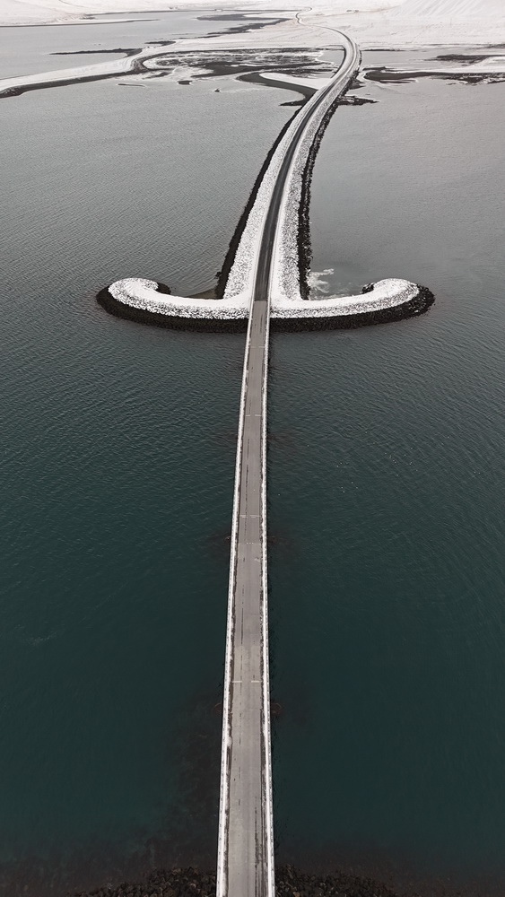 After that I could reach my goal of the day. At Grundafjordur they have built a bridge that you need to see from above. Otherwise you won’t see that it is built in the shape of a viking-sword. Fortunately we had the parking lot for yourselves so it was no problem to send the drone up. And I could see the sword. 🙂
