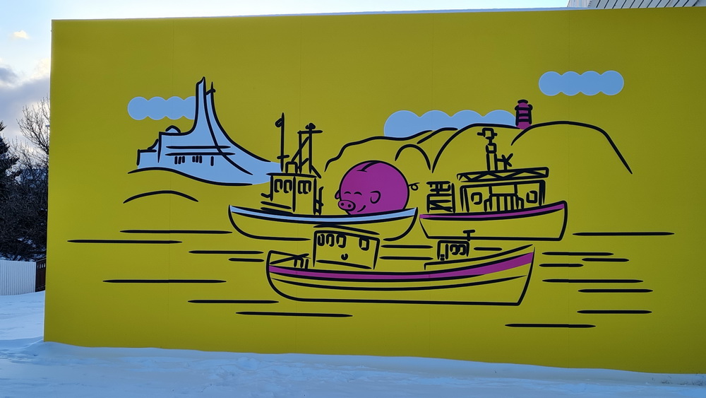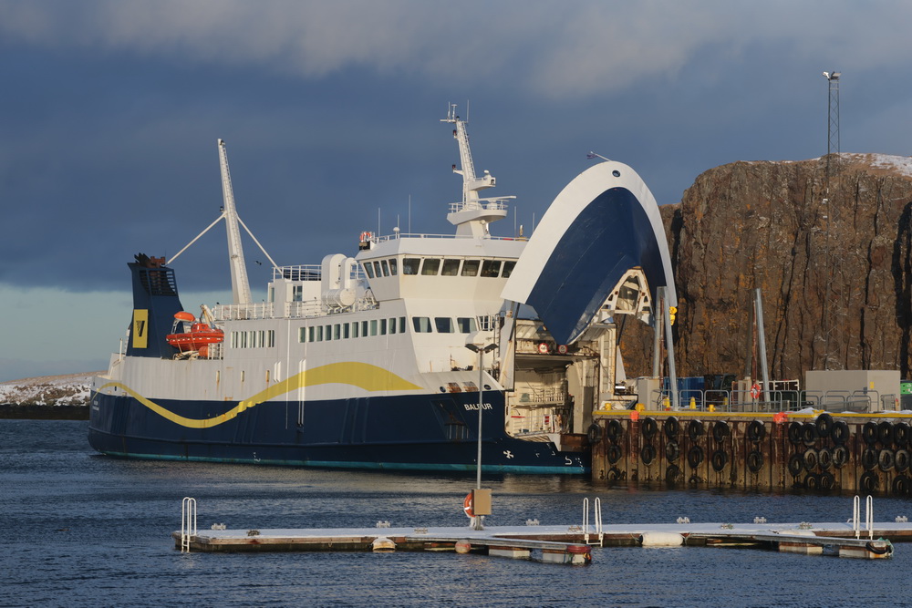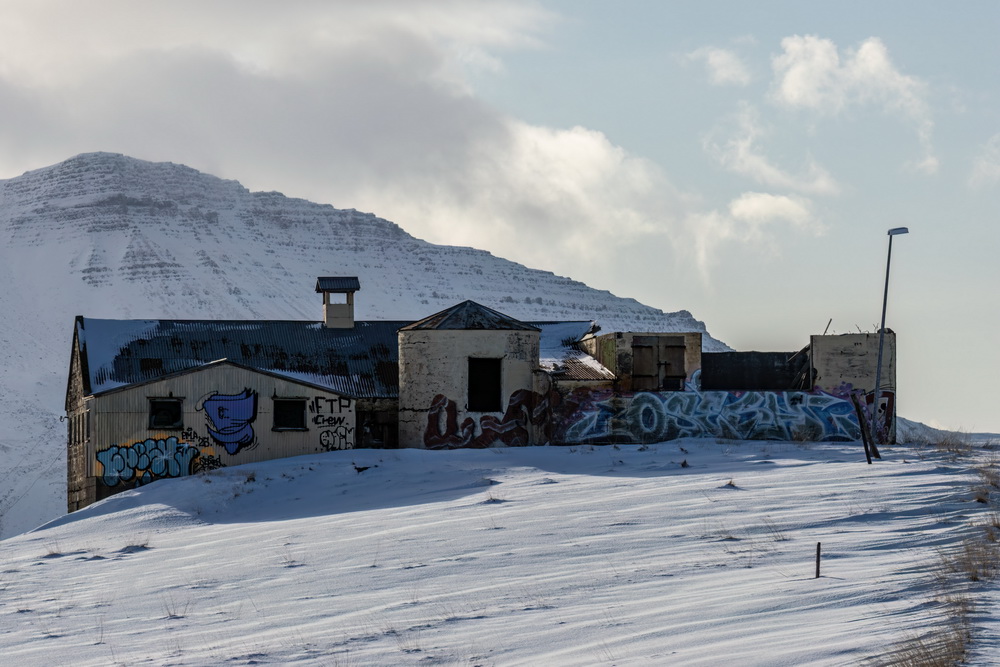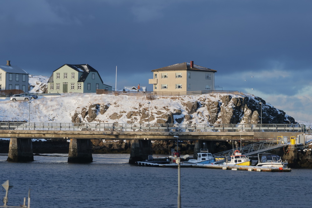 This was our departure from the Snaefellsnes area. I got up early and noticed that the owner’s dog was in front of my door. We had been informed that it roamed but I hadn’t seen it before. She went on to the next cabin though and had a good welcome there. 😉 After we had packed Helga we went back to Stykkisholmur first to get gas. Since there was a geocache close to the harbor we went there and it was a good idea because the sun came out and we had a photo session there. The ferry to the West-fjords was there but no activity so it didn’t look like it was leaving soon.