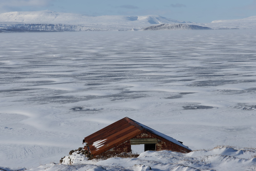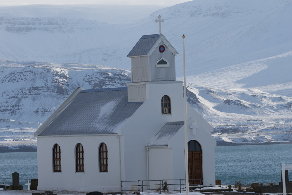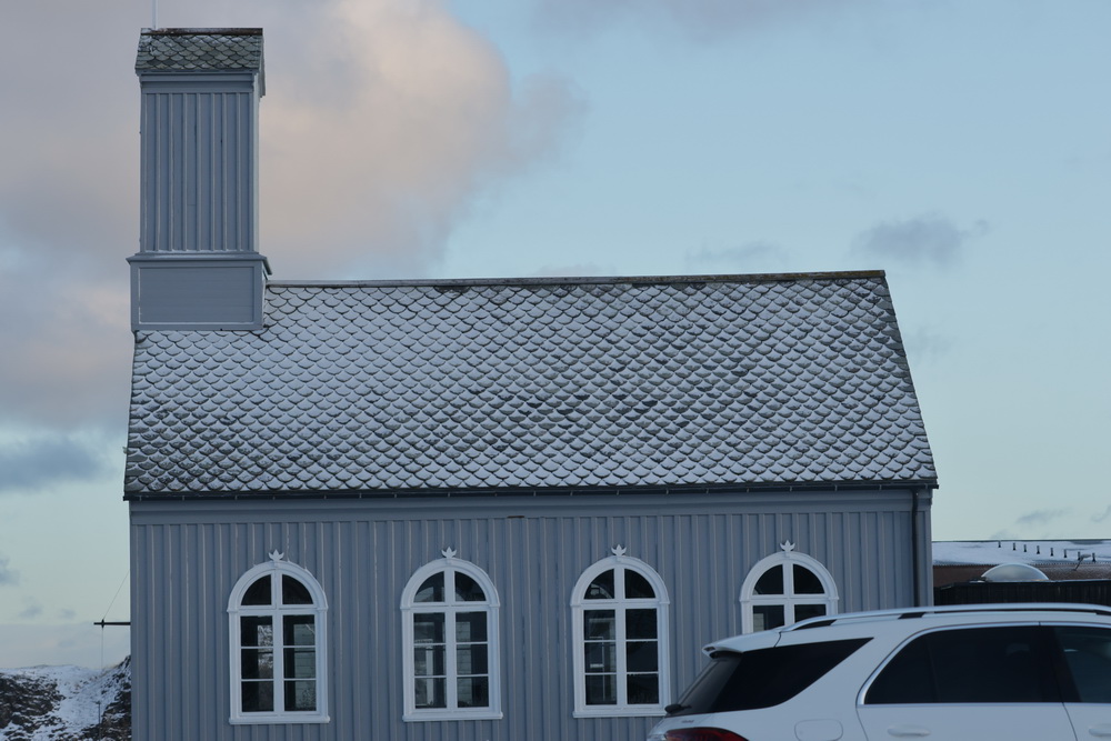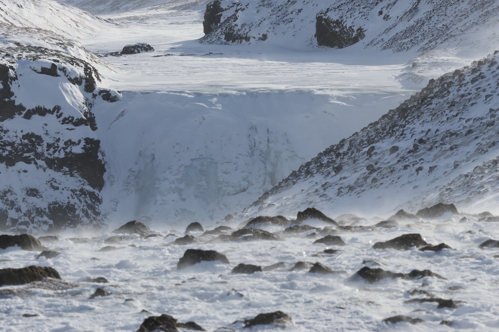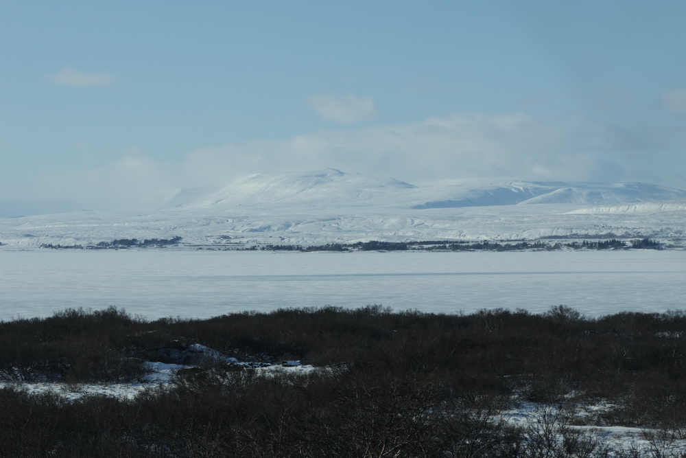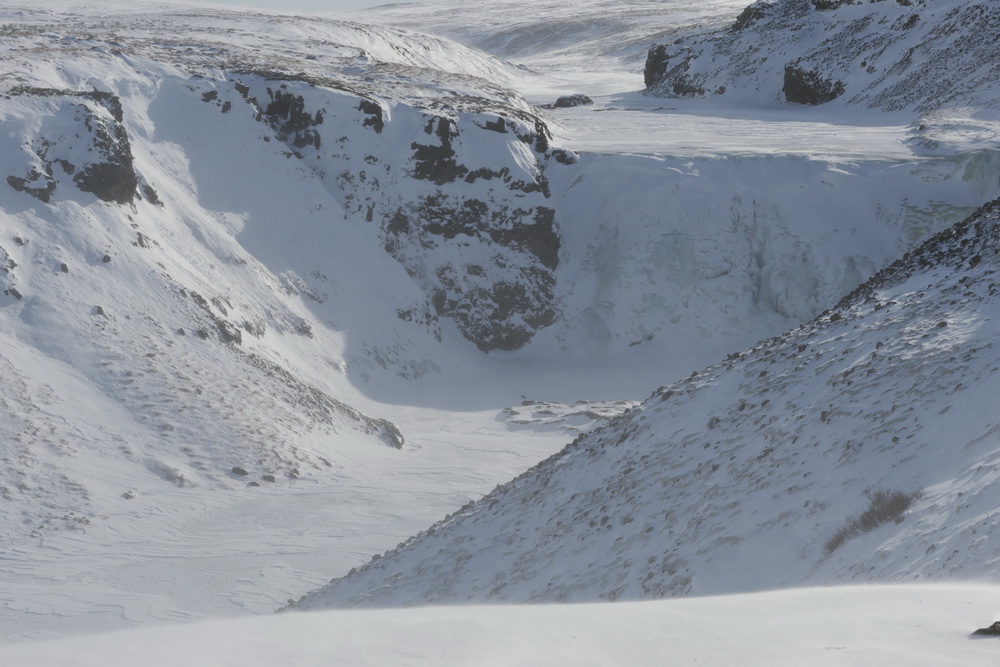 Shortly after that stop we took the road to Thingvellir National Park. Along the road is Mosfellskirkja whic is very unique with it’s tower. We found that the tower does not seem to be there any more. Hopefully they will rebuild it… We left the main road to a waterfall which I believe was Thorufoss (not sure if the first letter is actually a Th as it is an icelandic letter). 😉 The waterfall is supposed to be really nice – but it was frozen. And it was very windy. We took pics and below you find one and you might not recognize the waterfall. 😀