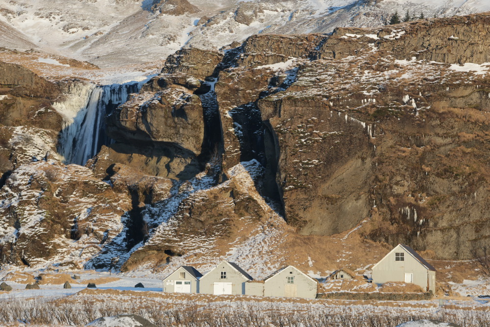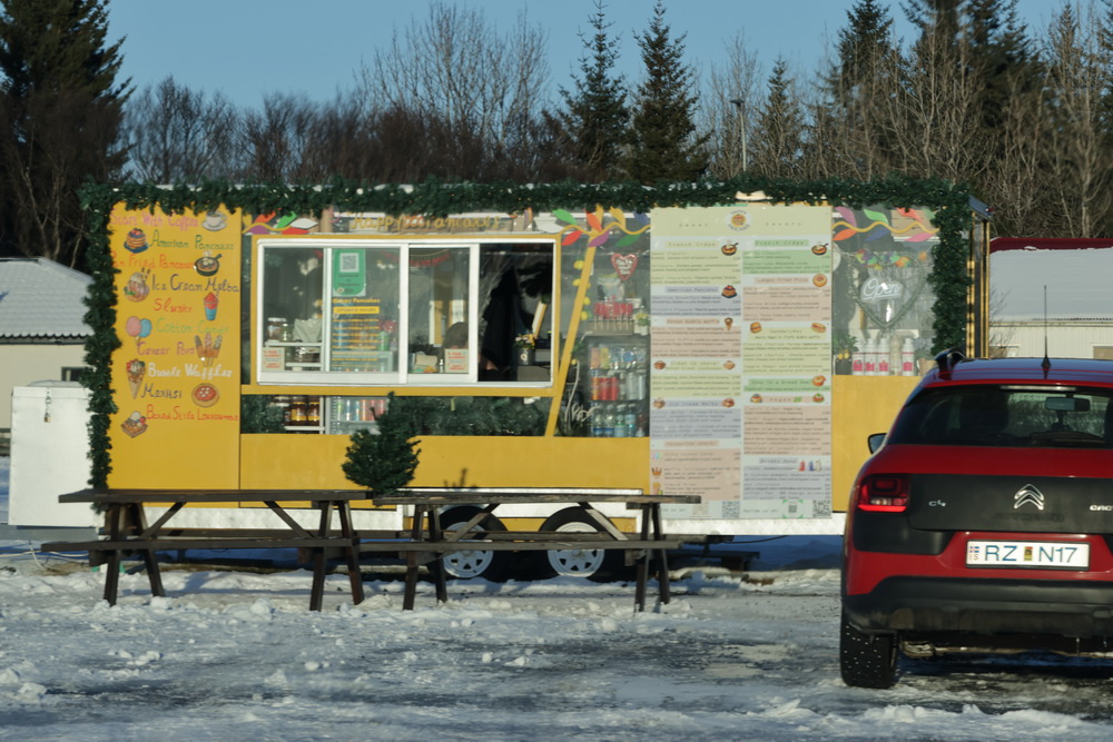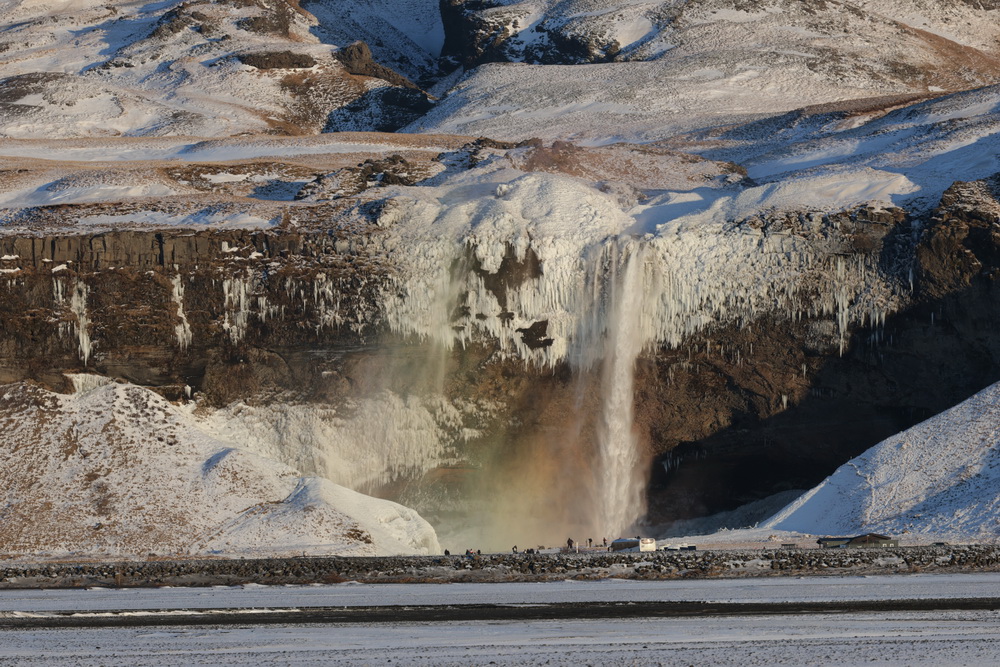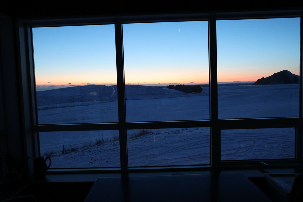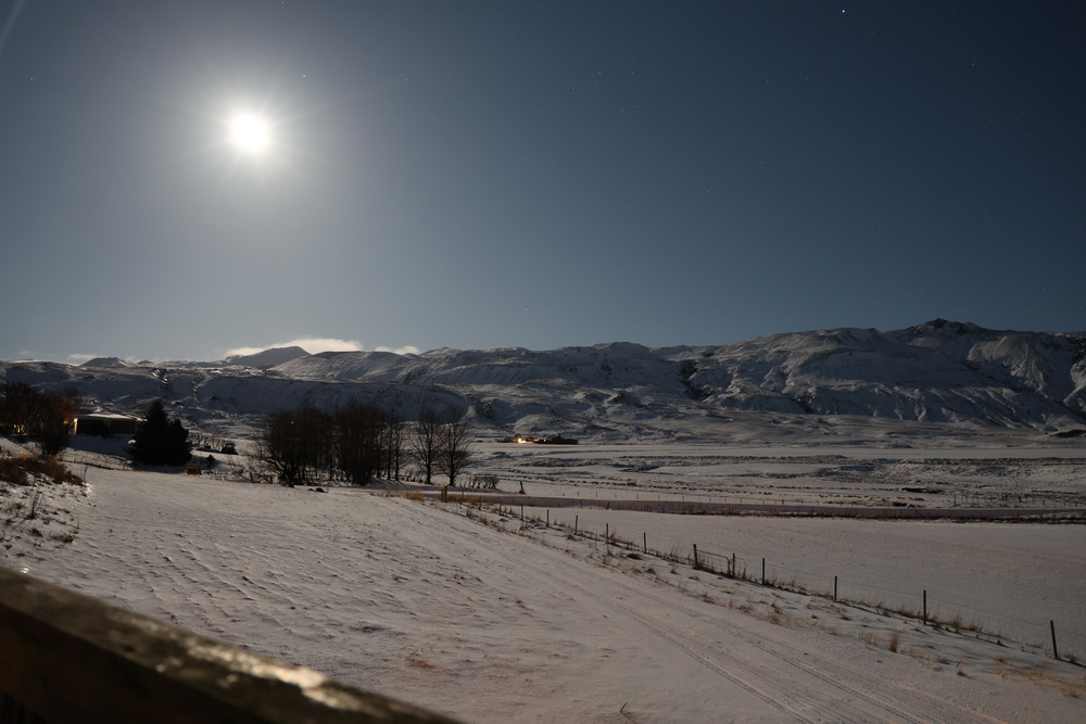 After that we continued through Thingvellir where you can snorkel between America and Europe. We stopped at a view point and the lake was frozen as well. I think snorkelling was still possible but we didn’t intend to do that. We stopped at a less frequented place later on to be closer to the frozen water. From there we went to Selfoss. Which is where we stopped for groceries but then I had to go to Kaffi Krus. This is a mandatory stop for me whenever I am in Iceland. 😉 We stopped at a shop that has local things. Nice shop! Then we continued on the Ringroad. Which is the one main road around Iceland. At the Seljalandsfoss waterfall we stopped on a road a bit further away. I wanted to fly my drone but it was dancing so much that I took it back down immediately. Then we went to our appartment for the day. It was in the middle of nowhere which in general was a nice idea. But for northern lights it wouldn’t have been ideal. We had a living area with panoramic windows and a nice view. The full moon came out and it we were waiting for northern lights since the sky was clear. But nothing… happens. 🙂