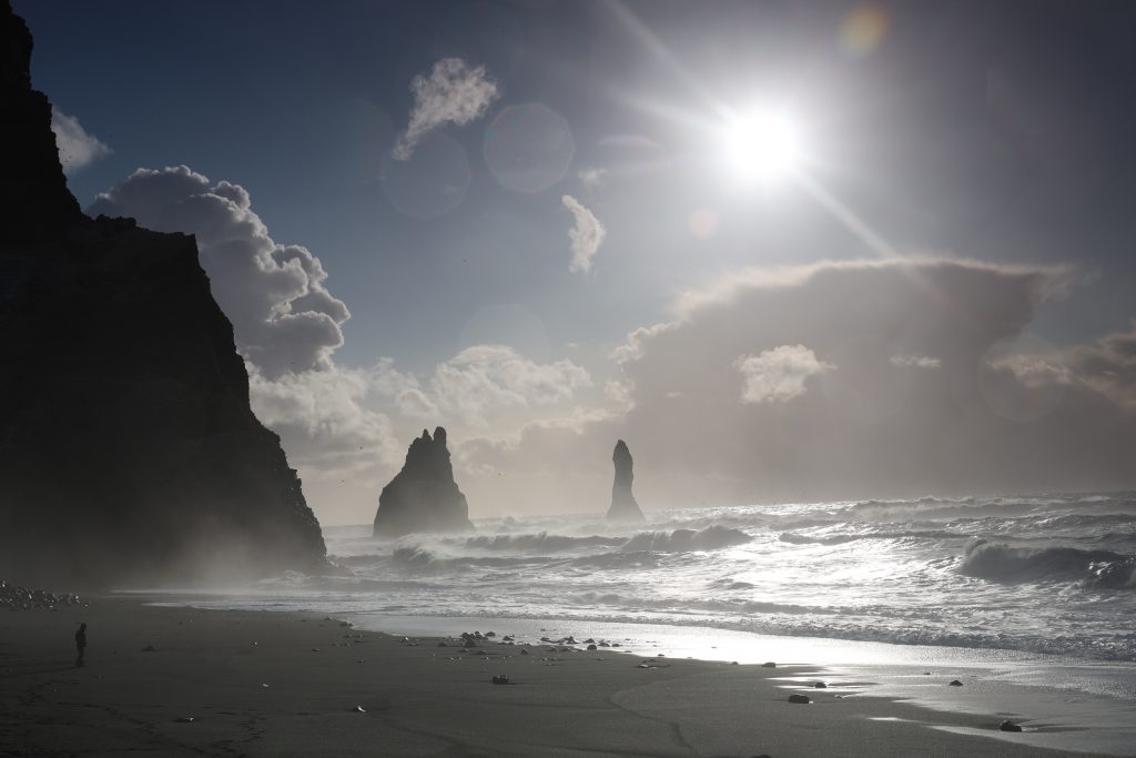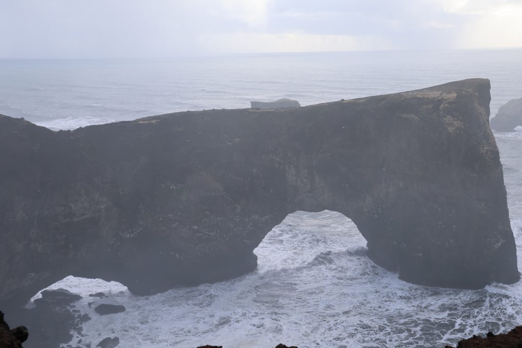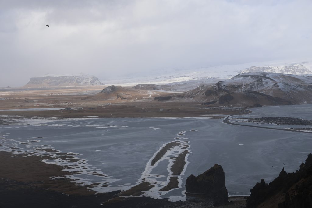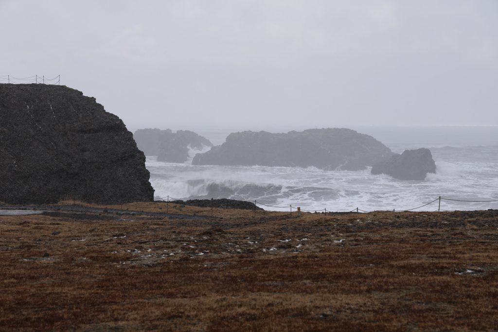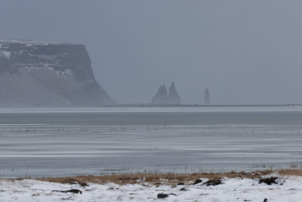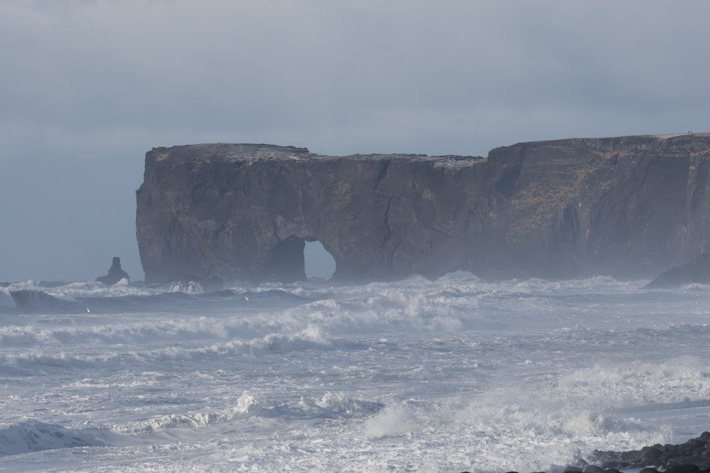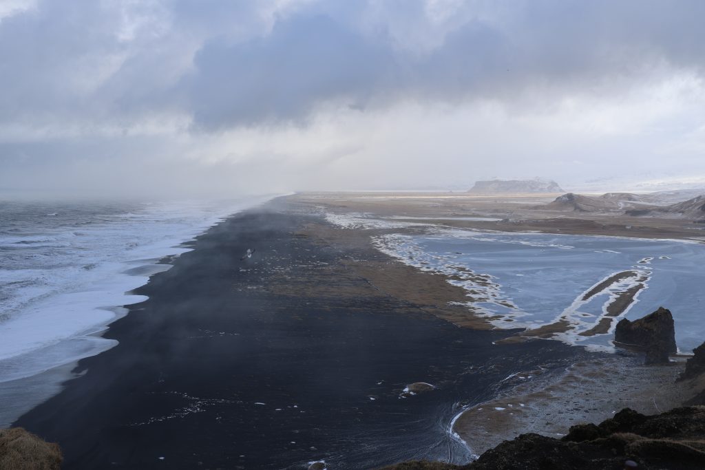 After we finally had enough (the later it got the more people were there and the more went down to the water)… we went back over to Dyrholaey. First we stopped to take pics of the frozen lagoon again and then we went up the hill. On top is a nice lighthouse but I hurried because I saw the rain coming. It was impressive up there because the ocean was in uproar (that was most of the time when we were there). There are two parking lots with walking paths, one is on top of the hill, the other one is a bit lower with a view over the beach that ends in Reynisfjara. I would have liked to walk more in the lower area but unfortunately my legs didn’t really want to do that. So I still took some pics but a bit less than I would have liked to.